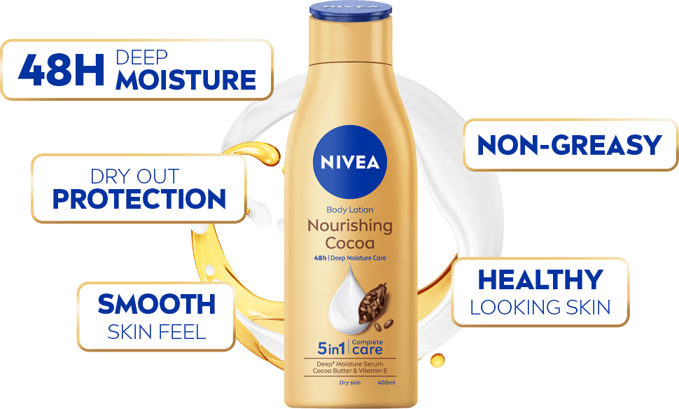 NIVEA Nourishing Cocoa gives your skin the rich moisture it craves when the air turns dry. It absorbs quickly, keeps your skin smooth all day and provides moisture for up to 48 hours. No heaviness. No stickiness. Just deep comfort.
